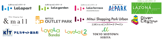 ららぽーと(TOKYO-BAY/豊洲/立川立飛/柏の葉/横浜/海老名/湘南平塚/新三郷/富士見/磐田/沼津/名古屋みなとアクルス/愛知東郷/安城/甲子園/和泉/EXPOCITY/堺/福岡)、ララガーデン(春日部/川口/長町)、ららテラス(武蔵小杉/TOKYO-BAY/HARUMI FLAG/川口/北綾瀬)、ラゾーナ川崎プラザ、三井アウトレットパーク(札幌北広島、仙台港、入間、幕張、木更津、多摩南大沢、横浜ベイサイド、北陸小矢部、岡崎、ジャズドリーム長島、滋賀竜王、マリンピア神戸、倉敷)、ららぽーと門真/三井アウトレットパーク 大阪門真、コレド室町1、コレド室町2、コレド室町3、日本橋三井タワー・三井二号館、コレド室町テラス、コレド日本橋、RAYARD MIYASHITA PARK、銀座ベルビア館、銀座並木通りビル、銀座トレシャス、ZOE銀座、ギンザ・グラッセ、交詢ビルDININGS & STORES、GINZA gCUBE、ニッタビル、赤坂Bizタワー SHOPS & DINING、東京倶楽部ビルディング 霞ダイニング、霞が関ビルディング 霞ダイニング、御徒町吉池本店ビル、新宿中村屋ビル、飯田橋サクラテラス、RAYARD Hisaya-odori Park、赤れんが テラス、ダイバーシティ東京 プラザ、アルカキット錦糸町、ラブラ万代、ラブラ2、淀屋橋odona、&mall/三井アウトレットパークオンライン、東京ミッドタウン(六本木)、東京ミッドタウン日比谷、東京ミッドタウン八重洲