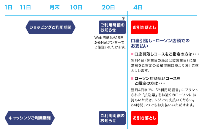 - ローソン店頭払いコースをご指定の方は、翌日までに「ご利用明細書」をプリントされた「払込票」をお近くのローソンにお持ちいただき、レジでお支払いください。24時間いつでもお支払いいただけます。