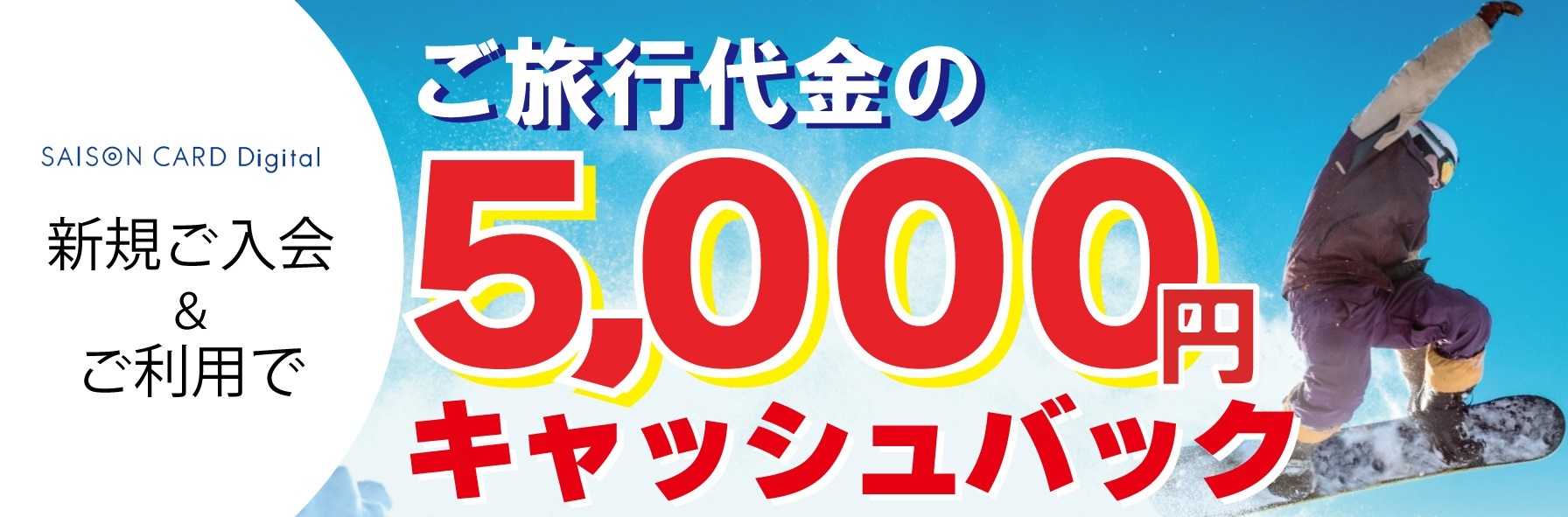 このページ限定!対象期間中にSAISON CARD Digitalの新規ご入会かつご旅行代金をお支払いいただくと、利用金額から最大5,000円キャッシュバック!
