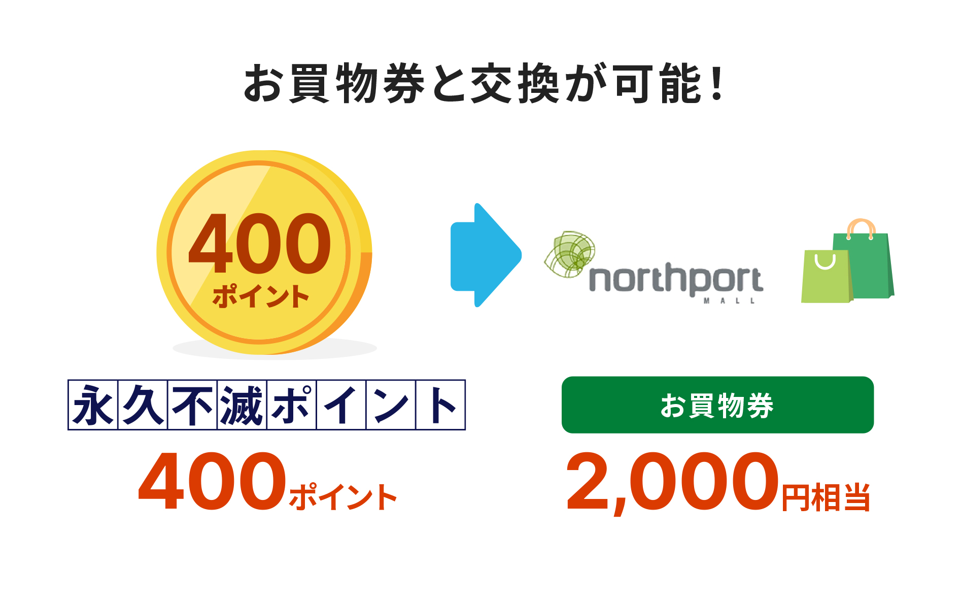 永久不滅ポイント400ポイントで、2,000円相当のNorthportカードセゾンお買物券とご交換いただけます。