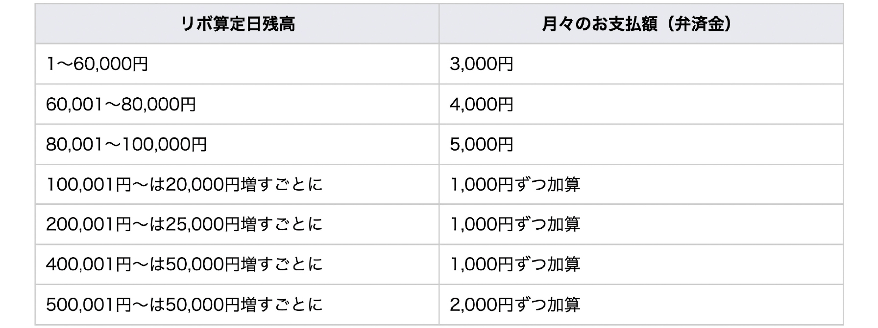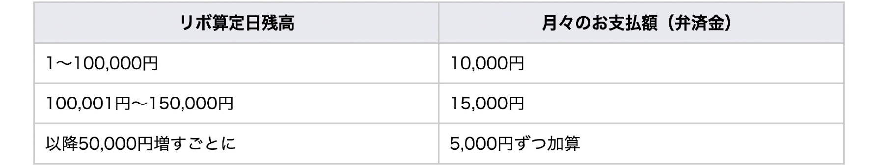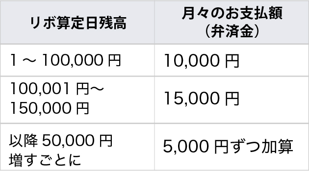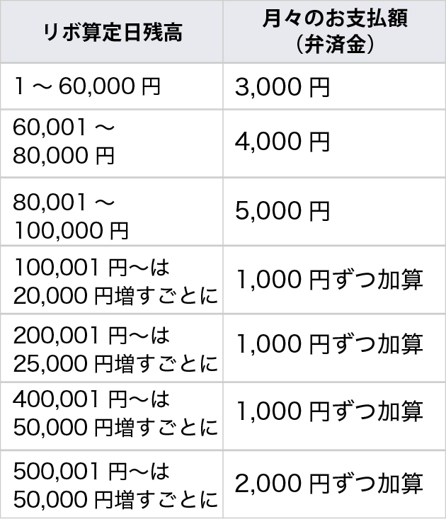 月々のお支払額は、リボ算定日残高に応じて1万円からとなります。
