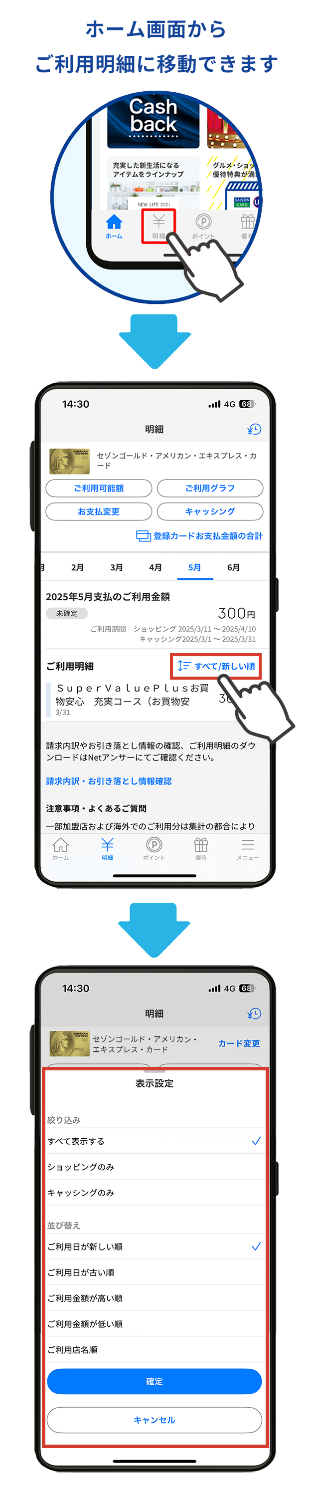 「すべて/新しい順」をタップするとご利用日、金額、店名などの条件で明細を並べ替えることができます。