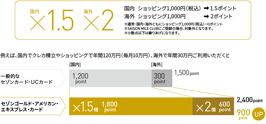 セゾンゴールド・アメリカン・エキスプレス®・カードなら、通常のセゾンカードよりもポイントが大きく貯まります。