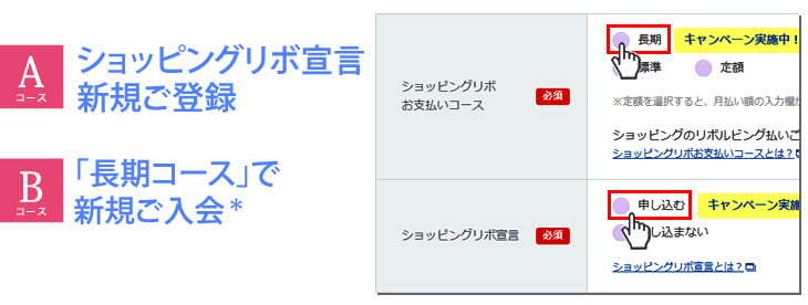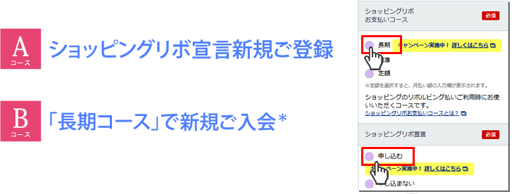 - * 新規カード入会時に「長期コース」をご選択の場合は、ショッピングの利用がなくてもキャンペーンの対象となります。