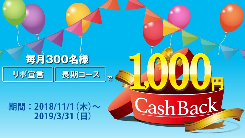 期間中、セゾンカード会員様限定で、「ショッピングリボ宣言 新規ご登録」、「新規ご入会時ショッピングリボ長期コースご選択*」、または「ショッピングリボ長期コースにご変更」いただき、ご登録・ご変更の翌月末までにショッピングを1万円(税込)以上ご利用いただいた方の中から抽選で毎月300名様、総計1,500名様に1,000円キャッシュバックいたします。