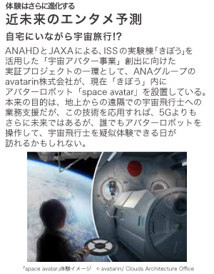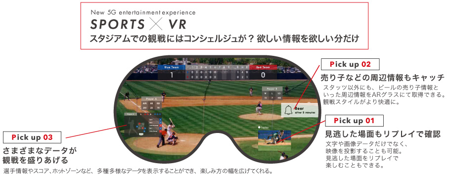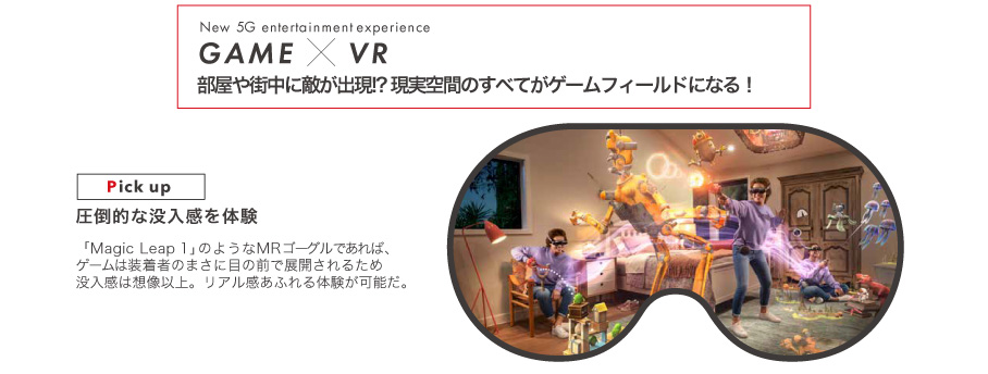 すでに仮想現実を表現する「VR」や、現実世界に情報を加える「AR」、ARをさらに進化させた「MR」といった技術が5Gによって進化し、普及するといわれているが、さらにそこにクリエイターの想像力も求められるようだ。「5Gではユーザー側の情報を大量に収集しAIで処理できるようになるため、エンタメをより能動的に楽しめるようになります。例えば、スポーツ観戦であれば、ARグラスなどを使うことで、スタジアムで試合を観ながら、同時に選手情報やスコアなどを確認できるようになったり。人間の想像力次第で、エンタメ体験は、もっと進化していくはずです」。