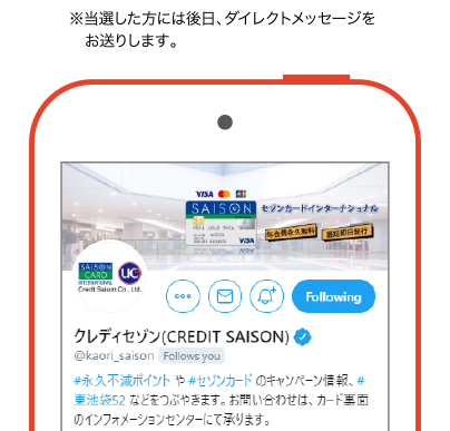《個人情報の取扱い》 個人情報は、株式会社クレディセゾンが、賞品の発送やご当選の連絡の他、個人を特定しない統計的情報の形で利用させていただきます。(管理責任者:株式会社クレディセゾン)