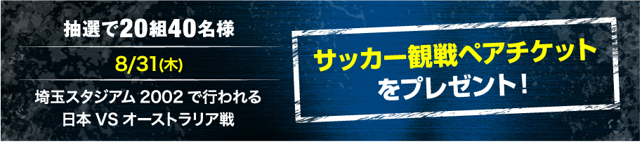 期間中エントリーのうえ、セゾンカード・UCカードでのショッピングご利用金額合計5,000円(税込)以上の方の中から、抽選で20組40名様に、 埼玉スタジアム2002で2017年8月31日(木)に行われる「日本VSオーストラリア戦」のサッカー観戦ペアチケットをプレゼントいたします。