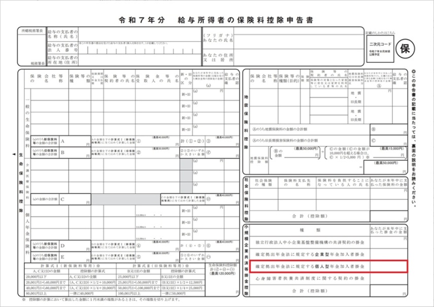 「給与所得者の保険料控除申告書」は通常、勤務先から従業員に配布されます。申告書の右下にある「確定拠出年金法に規定する個人型年金加入者掛金」の欄に、年間での掛け金の合計額を記入します。