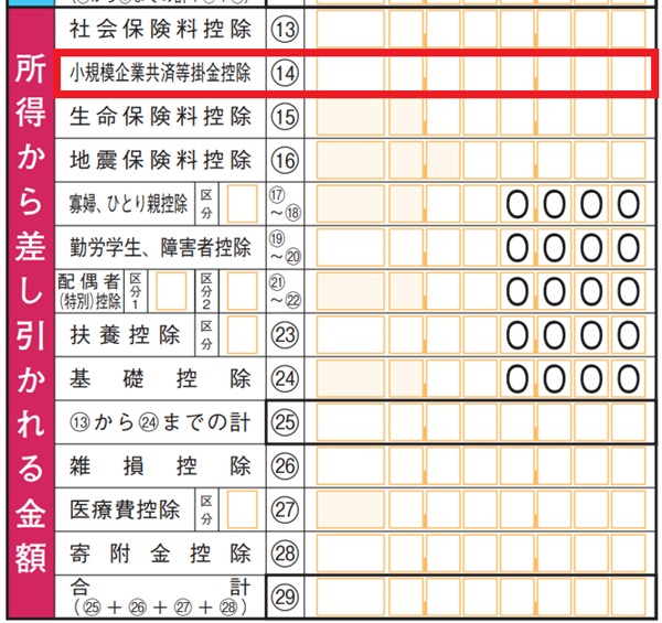 確定申告書第一表には「⑭小規模企業共済等掛金控除」の欄に、掛け金の合計額を記入します。