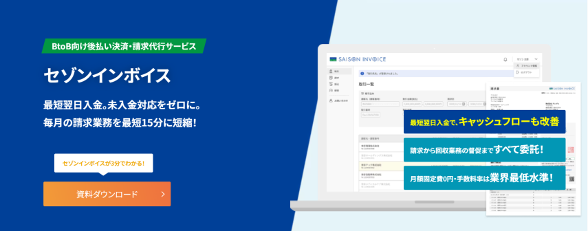 資金繰りの改善には、ファクタリング以外にも効果的な選択肢があります。特に注目したいのが、クレディセゾンが提供するBtoB向け後払い決済・請求代行サービス「セゾンインボイス」です。