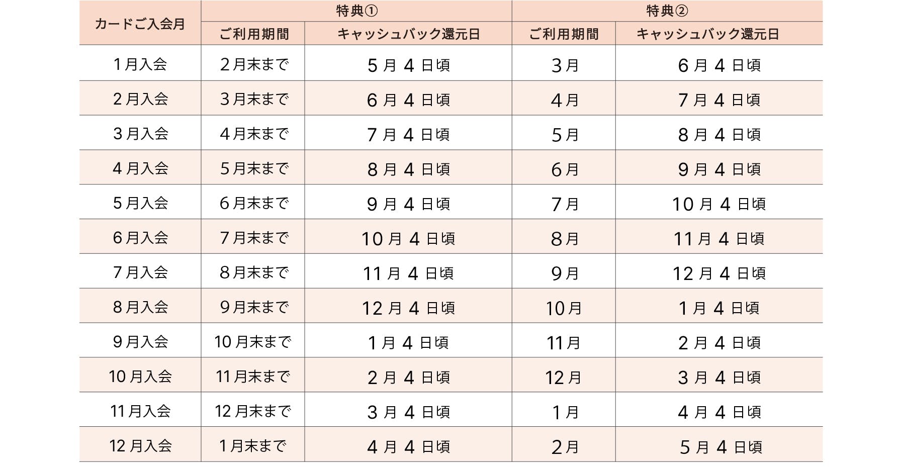 - キャッシュバックにつきましては、上記表の対象引き落とし日にご利用金額分に充当させていただきます。