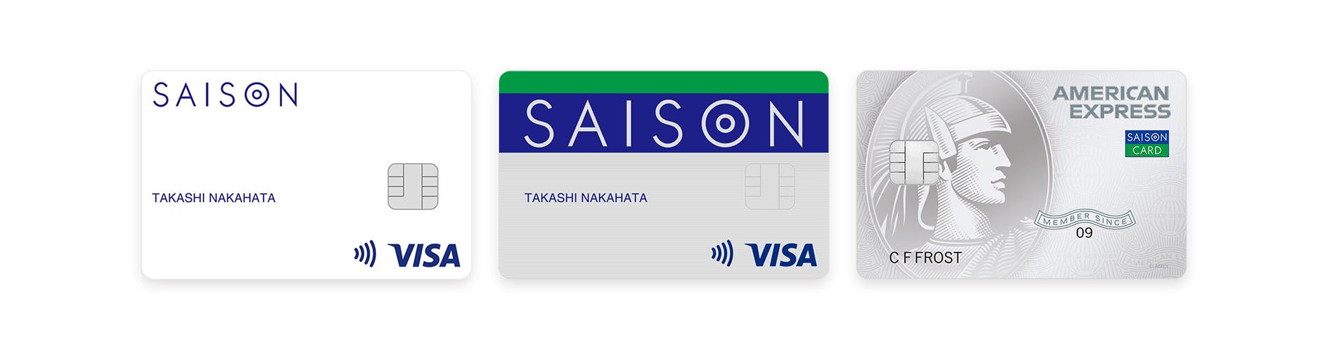 「セゾンカードインターナショナル」のカードデザイン。グレーと白色の細かいボーダー柄。カード上部に青色の背景色に大きく白色のSAISONのロゴ、その下に緑色の横線が入っている。