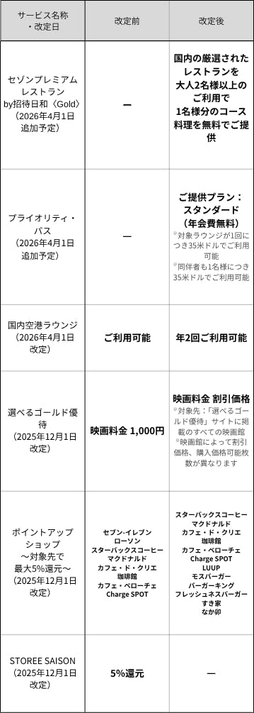 追加予定のサービス「セゾンプレミアムレストランby招待日和〈Gold〉」「プライオリティ・パス」につきましては、2026年4月1日(水)以降にご利用ガイドページにて詳しくご案内いたします。