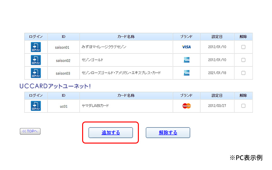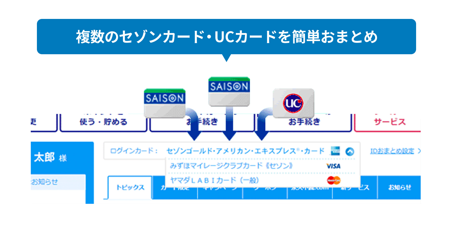 - おまとめの対象となるIDは、セゾンNetアンサーのIDと、UCアットユーネット!のID(クレディセゾン発行のカードに限ります)です。