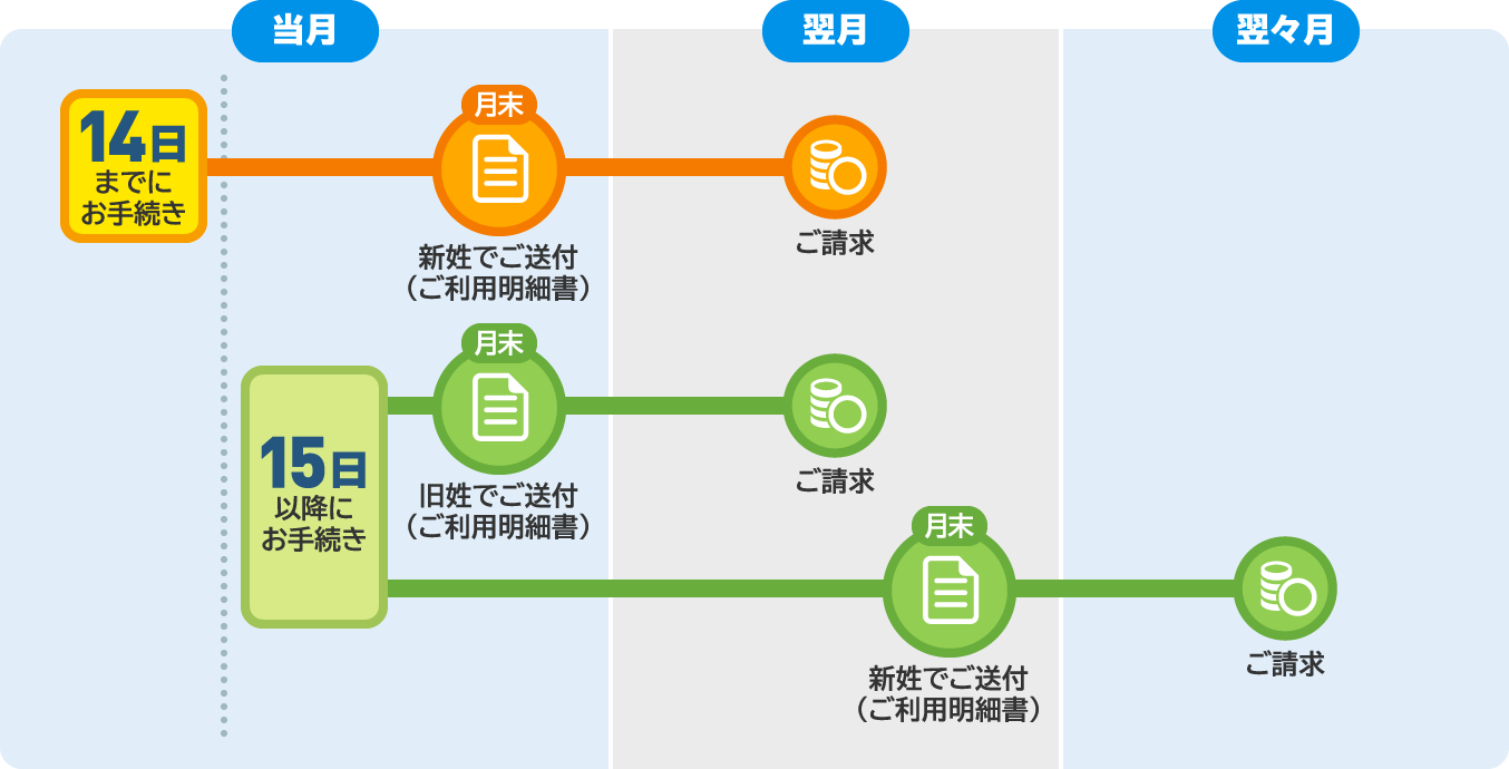 - 毎月14日までにお手続きされた場合、当月末にお届けする翌月請求のご利用明細書から新しいご住所にお送りいたします。