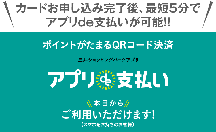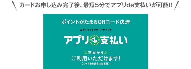 カードお申し込み完了後、最短5分でアプリde支払いが可能!! カードお申し込み完了後、最短5分でアプリde支払いが可能!!