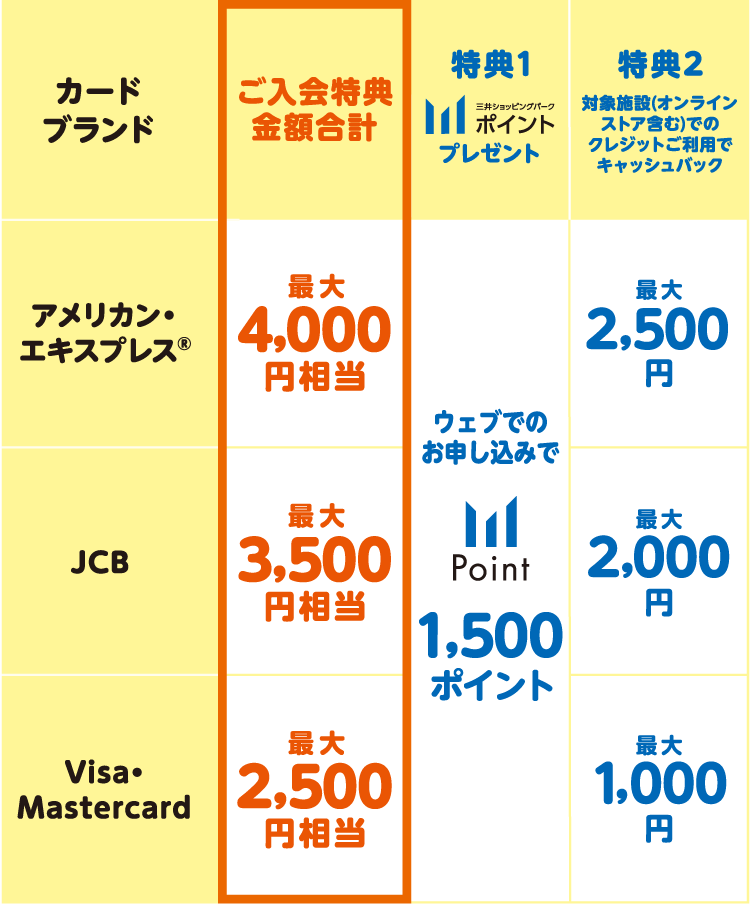 WEBよりご入会いただくと、お選びいただいたカードブランドに応じた入会特典をプレゼントいたします。