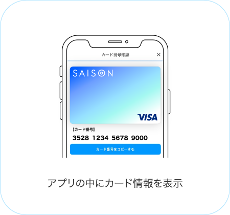 公式アプリ[セゾンPortal]上の「カード番号確認」より、“カード番号”・“有効期限”・“セキュリティコード”・“カード名義”の情報をご確認のうえご利用ください。