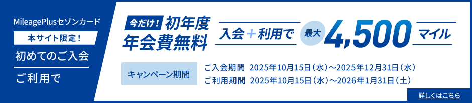 - すでにMileagePlusセゾンカードをお持ちの方はまたは、過去にお持ちいただいていた方(解約済み)対象外とさせていただきます。