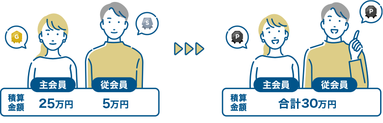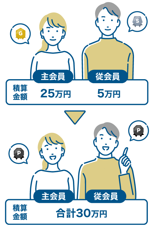 家族連携とは、主会員の方と最大9名のご家族(従会員)を連携し、家族全員の積算金額を合算できるサービスです。