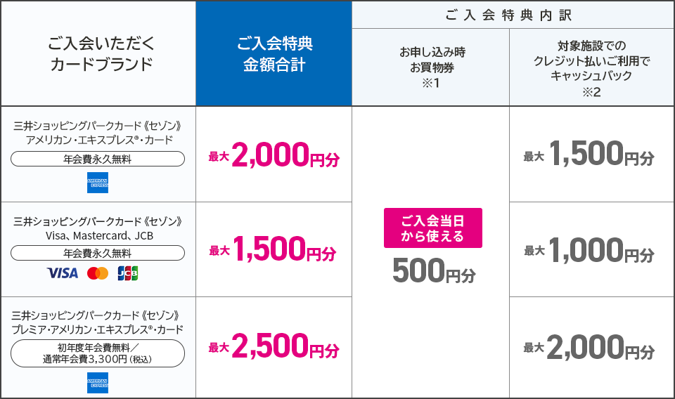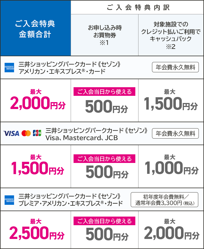 - ※三井ショッピングパークカード《セゾン》プレミア・アメリカン・エキスプレス®・カード/ラゾーナ川崎プラザカード《セゾン》プレミア・アメリカン・エキスプレス®・カードの場合、初年度年会費無料(通常年会費 3,300円/税込)になります。