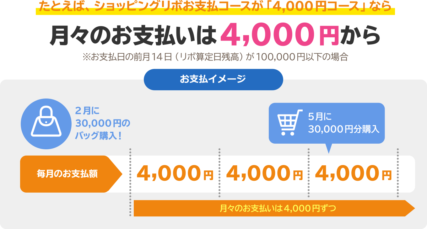 - キャッシングリボ「4,000円コース」は新規お取り扱いを終了いたしました。なお、終了日以前に「4,000円コース」を選択されているカードは引き続き「4,000円コース」でご利用・お支払いいただけます。