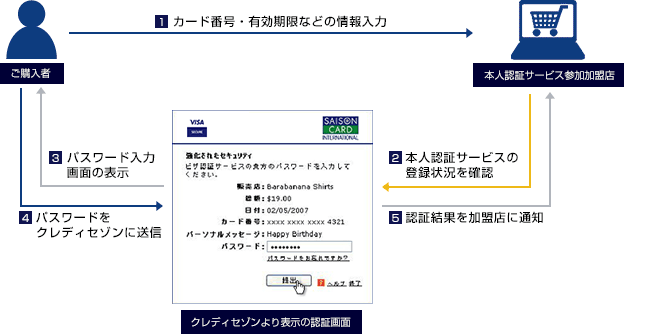 本人認証サービス対象のネットショッピングでは、ご購入者様と加盟店との通常のお取り引きに加え、ご購入者様がセゾンカード会員ご本人様であることをクレディセゾンが確認いたします。