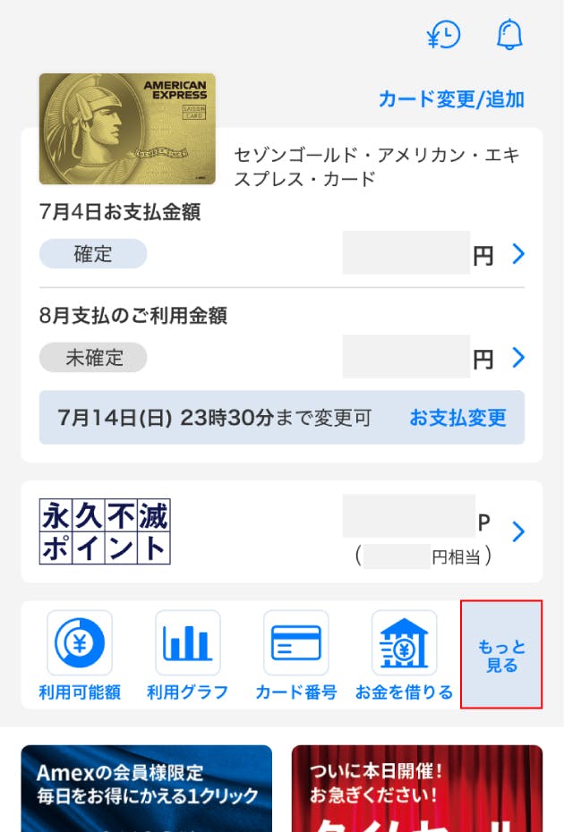 ②アプリトップの画面中央のアイコン一覧の右端「もっと見る」をタップ